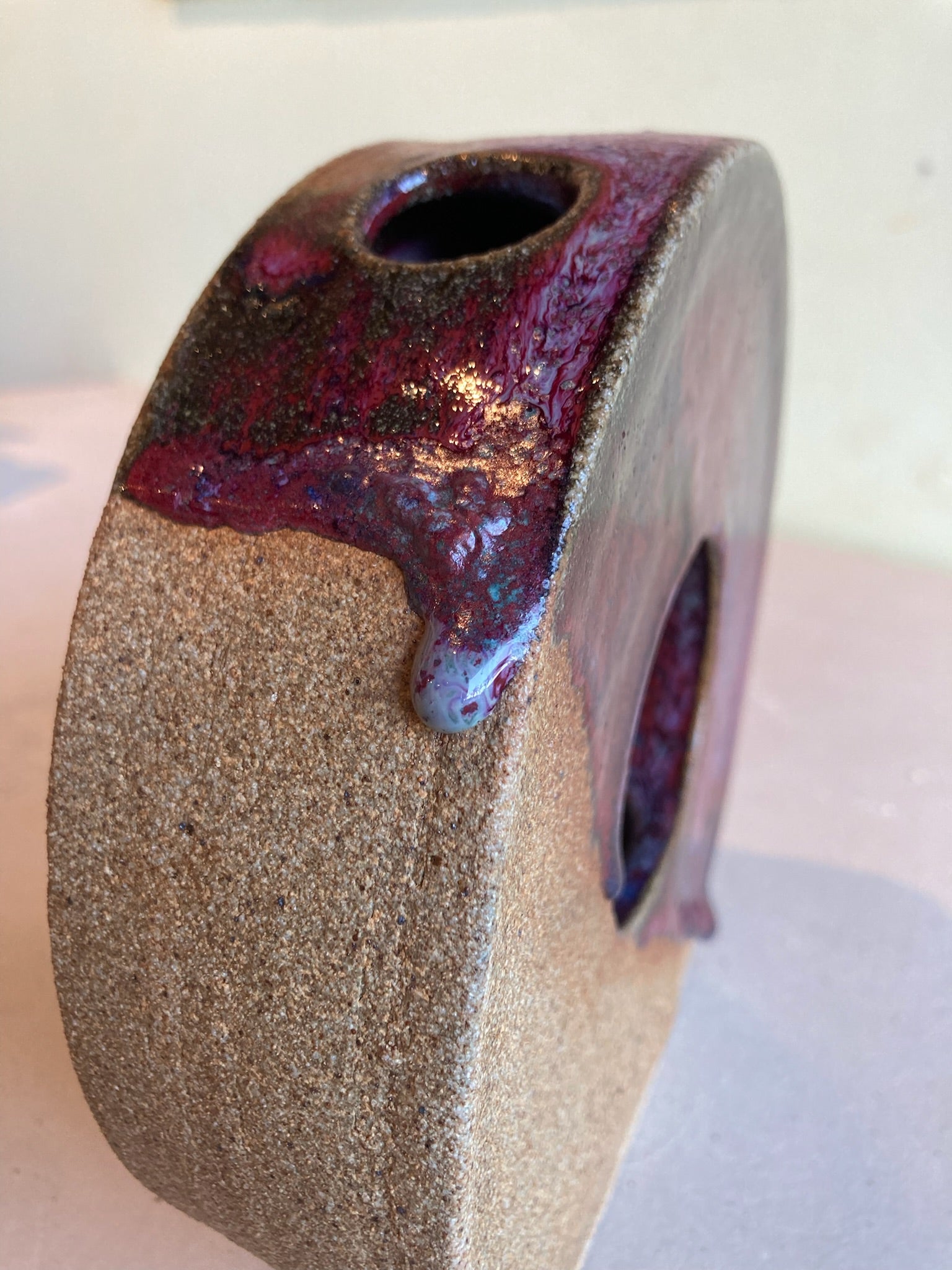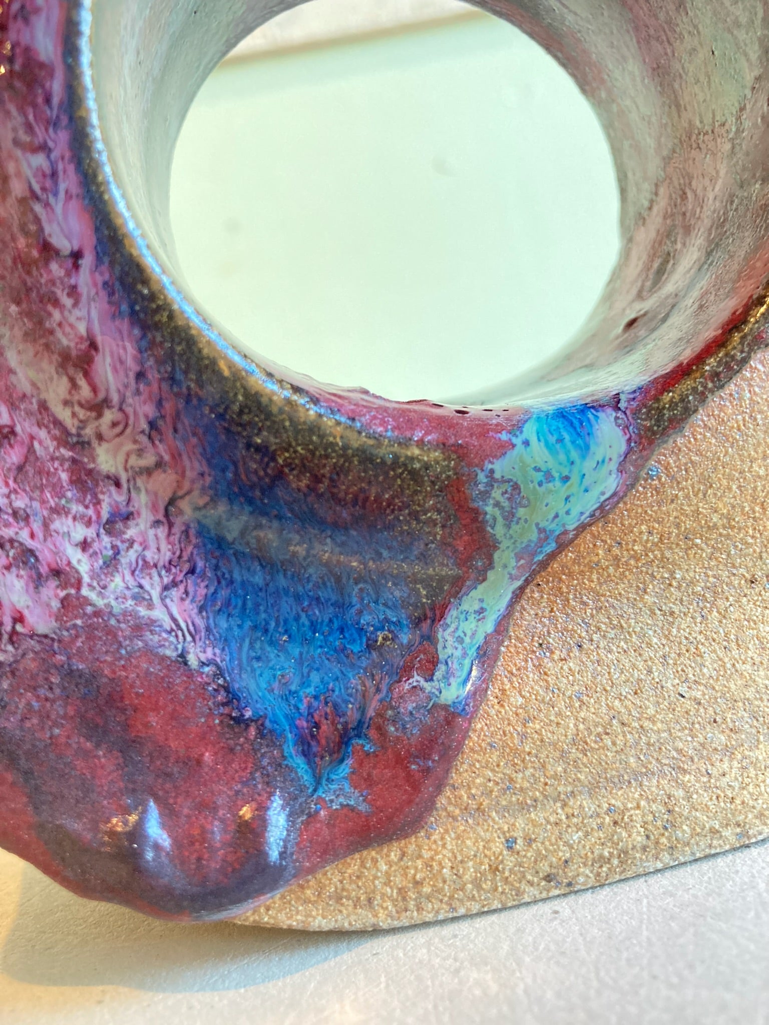 The unglazed base showcases the beautiful, grainy texture of the natural stone, providing a perfect counterpoint to the dramatic, flowing glaze. This sculptural donut vase is designed to be a bold statement piece. Display it as a standalone work of art on a shelf, mantel, or table, where its unique form and intense colors can be fully appreciated.