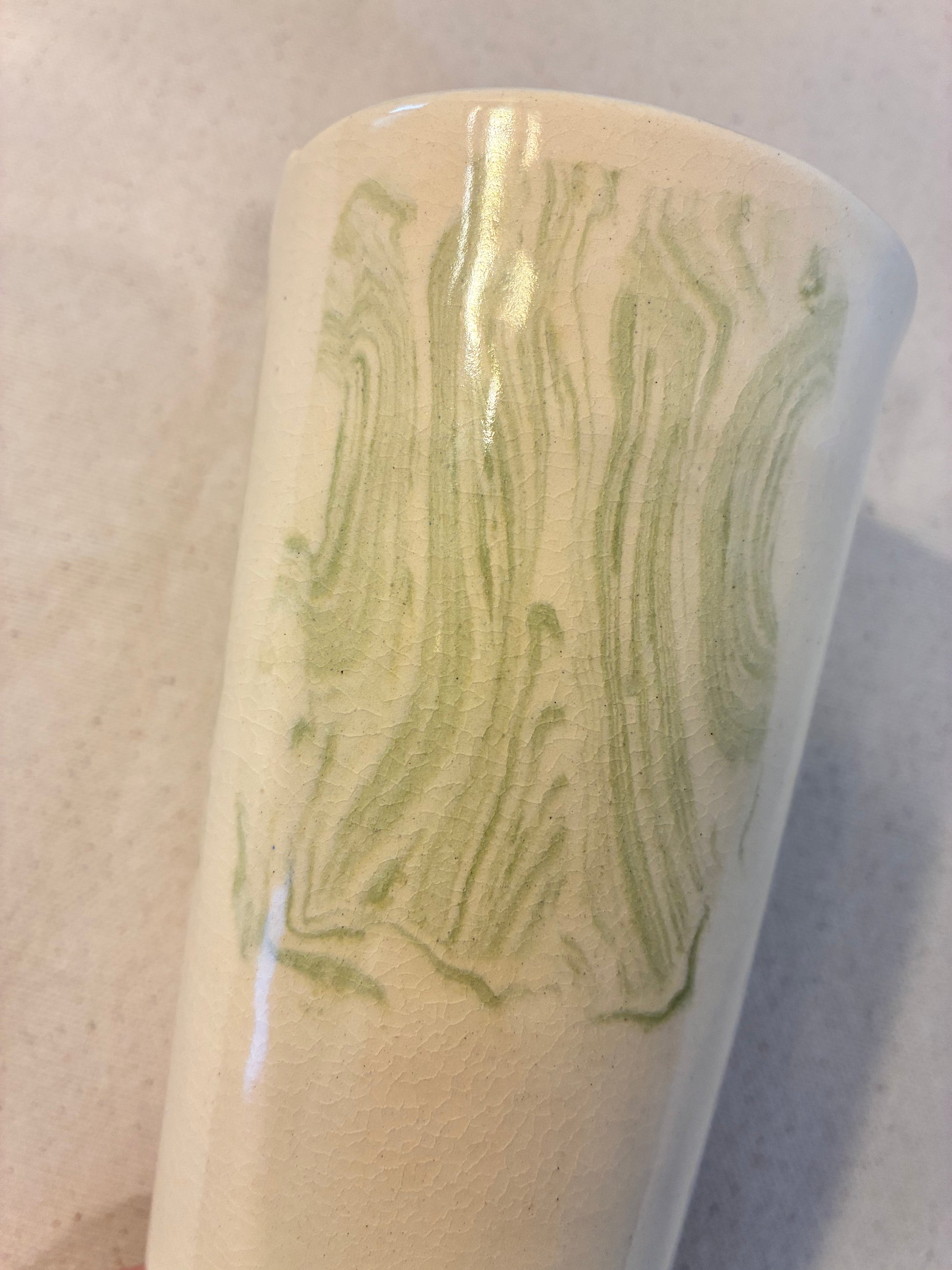 A best seller! This Lime Light Nerikomi Travel Mug is a stylish and sustainable way to take your favorite beverage with you on the go. Suitable for hot or cold drinks, it features a sippable splash guard that can also hold a straw. The subtle, swirling lime-toned nerikomi decoration was lovingly layered and inlayed into the creamy white clay. A crowdpleaser gift.