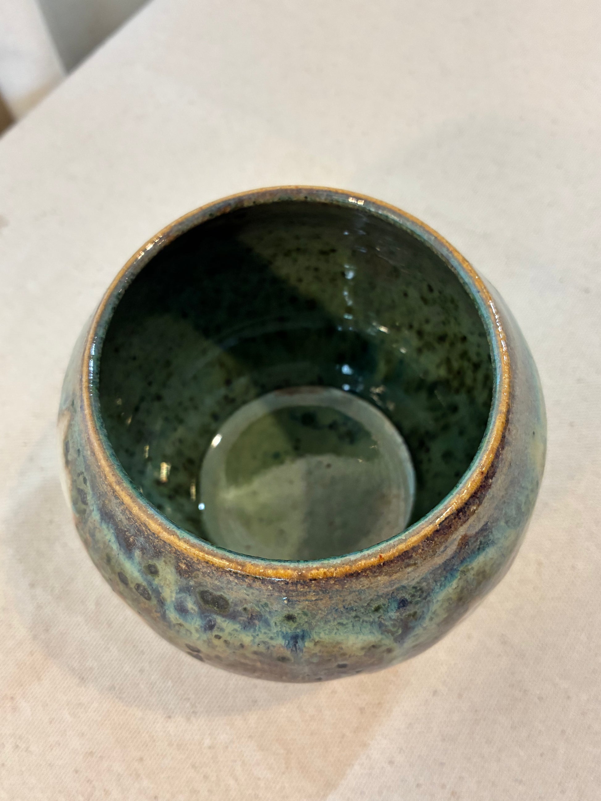 The Patina Mini Moon Planter makes a sweet home for your small plant friends. Named for its an orb-like shape, this pot features a closed bottom to protect your surfaces. Lovingly painted with a stone glaze and a cascading patina of forrest green, this petite vessel makes a small, but striking addition to any shelf, windowsill, or desk with or without accompanying botanicals.